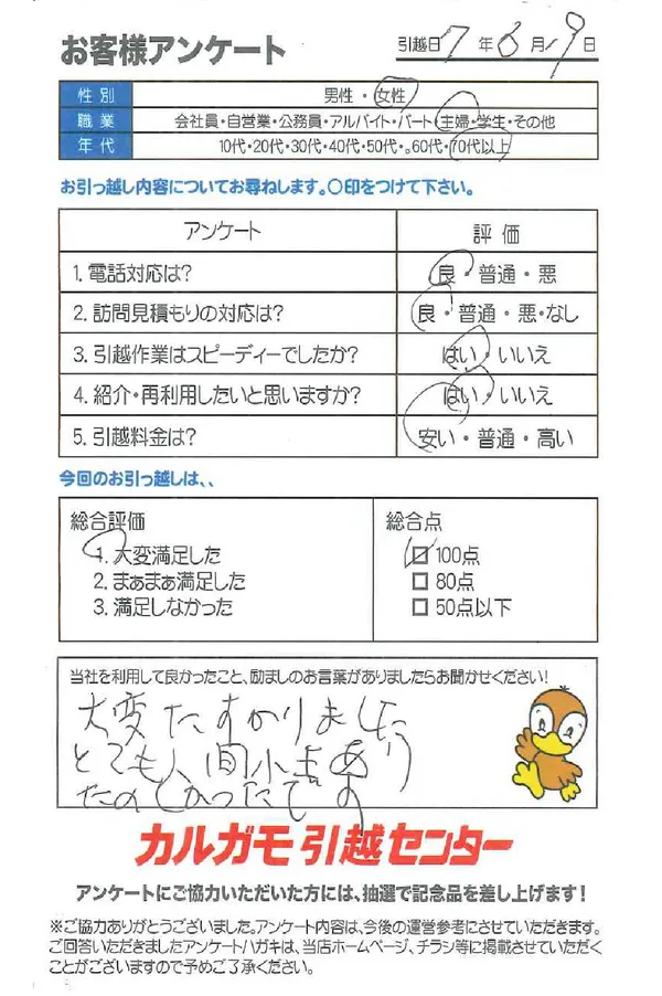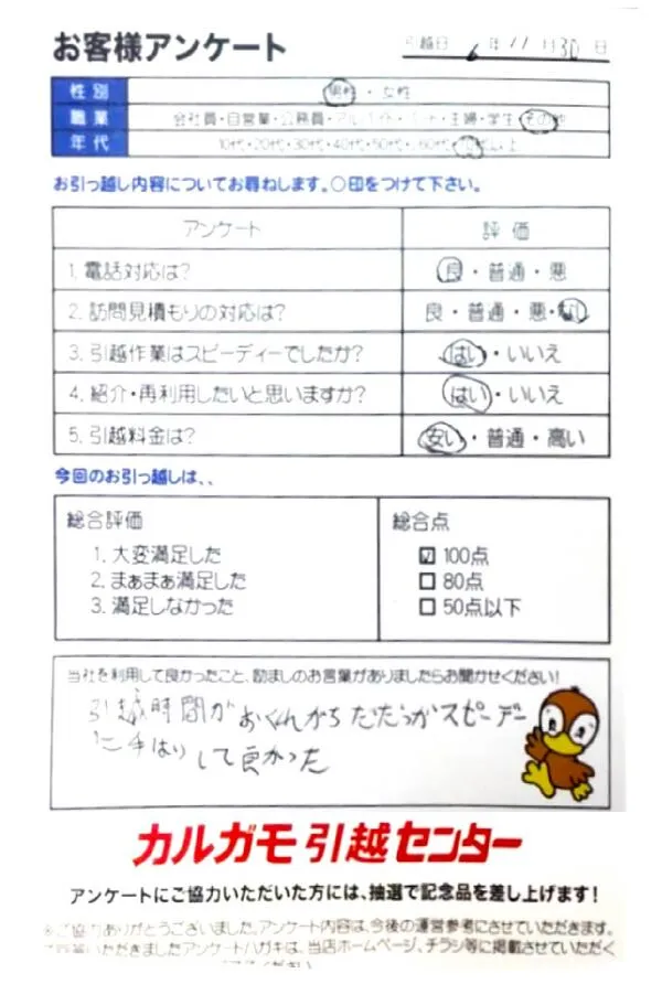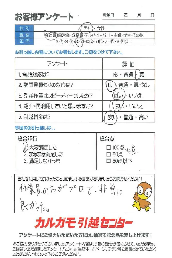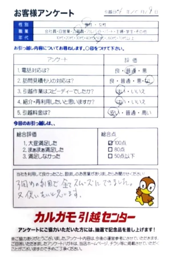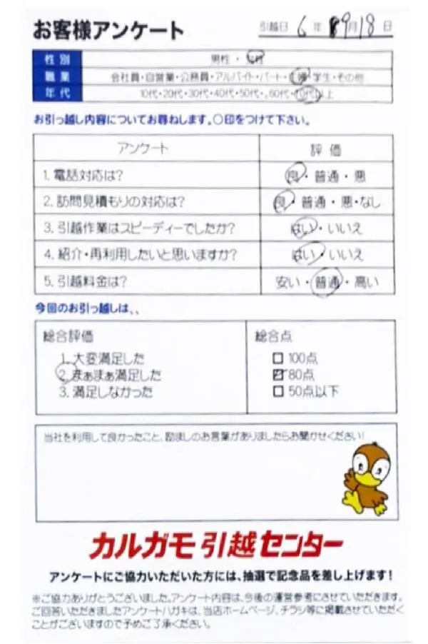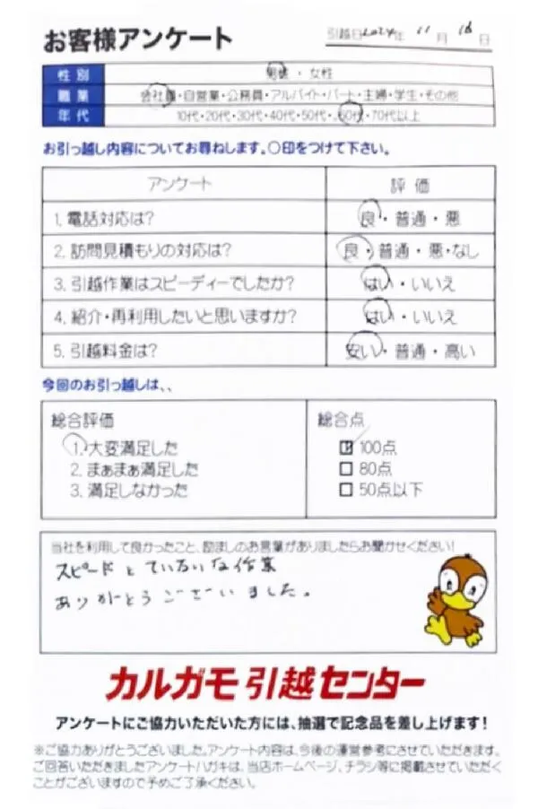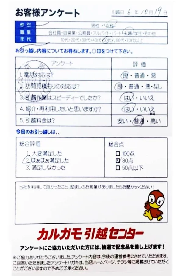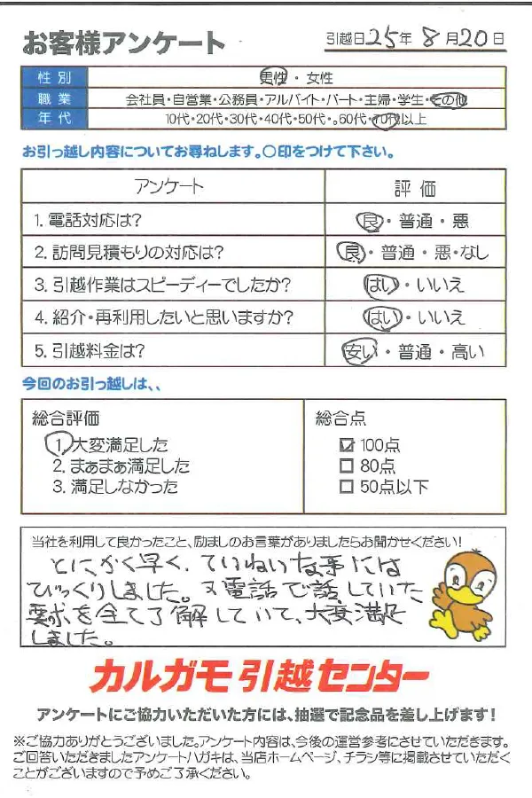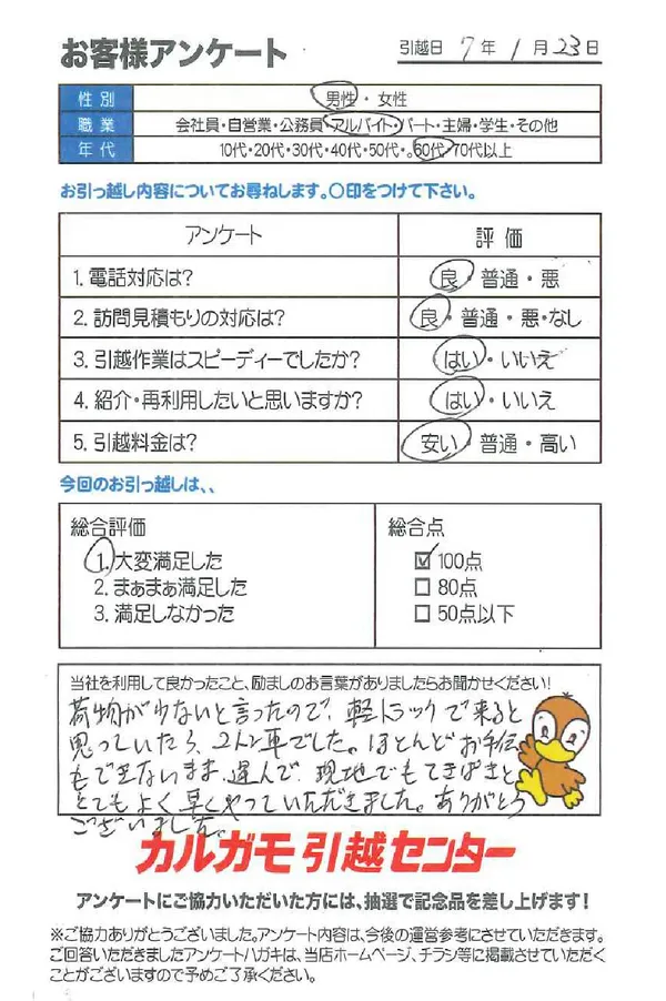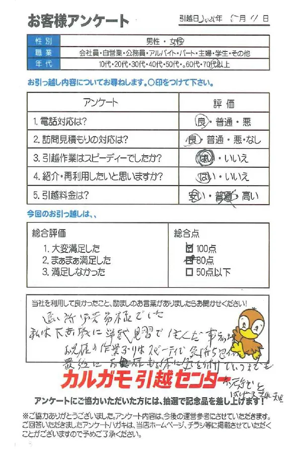 カルガモ引越しセンターをご利用いただいたお客様の体験談・口コミ・評判を掲載しています。