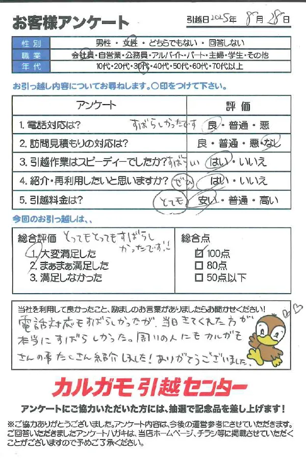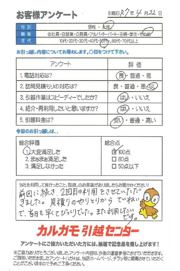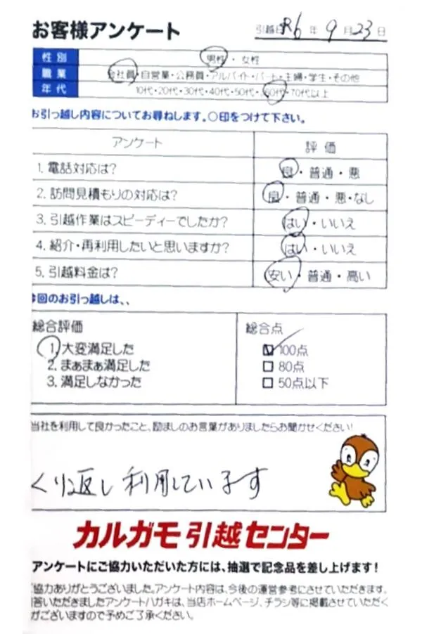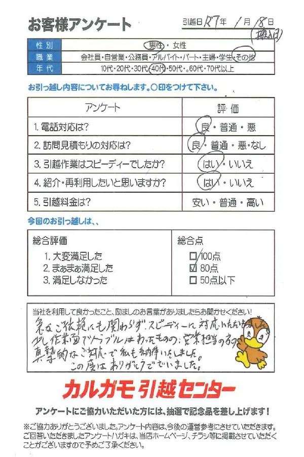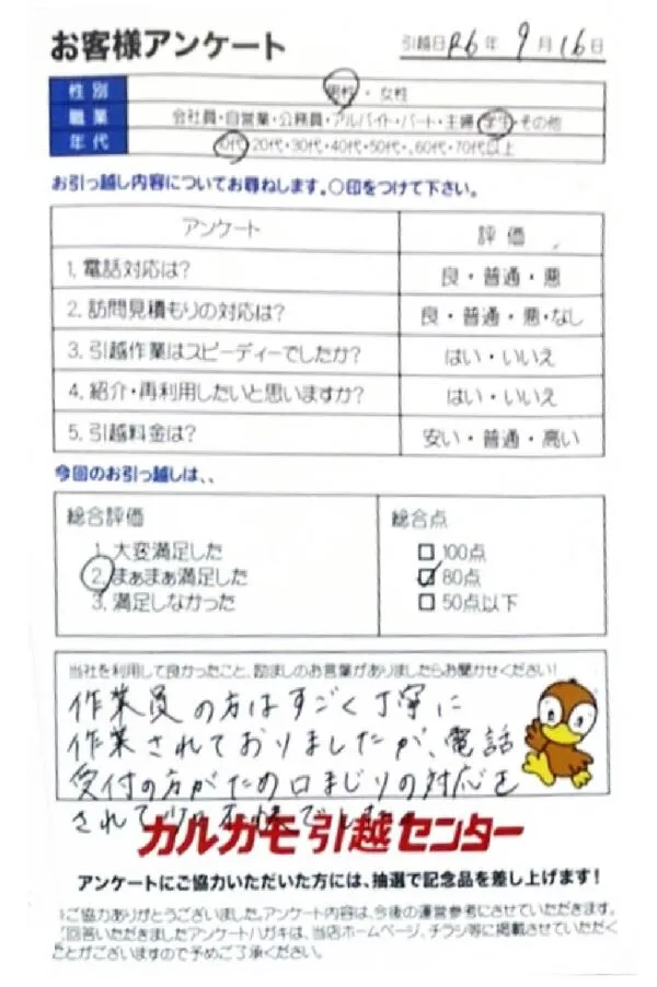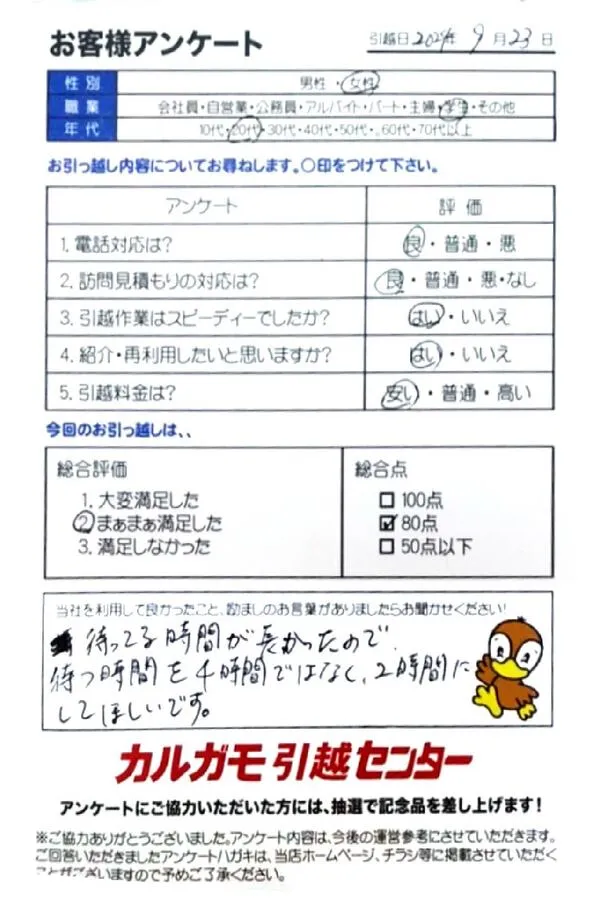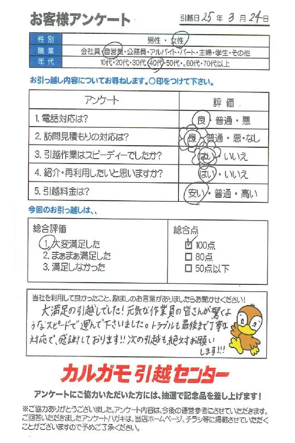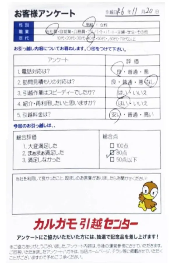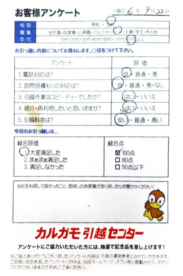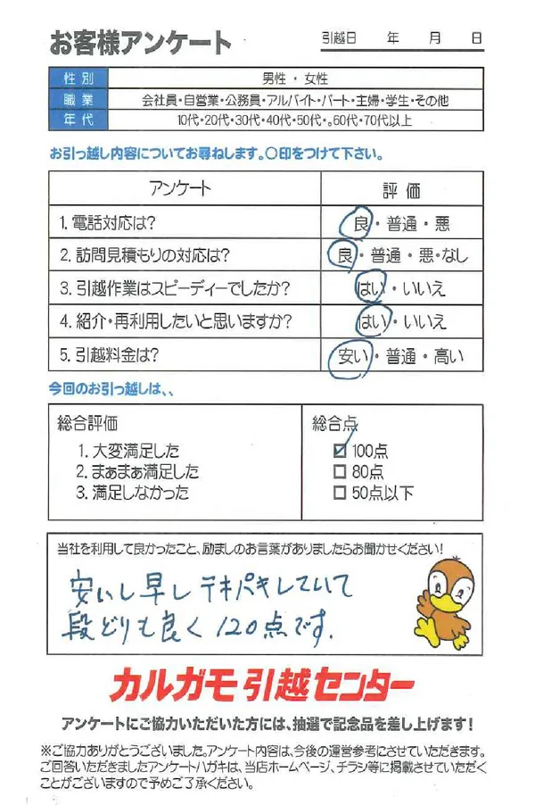 カルガモ引越しセンターをご利用いただいたお客様の体験談・口コミ・評判を掲載しています。
