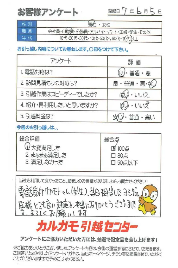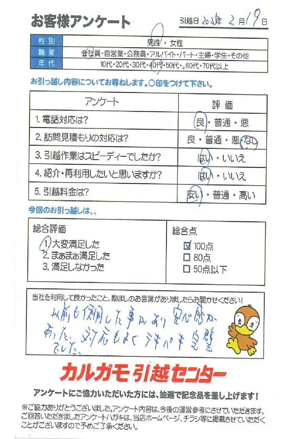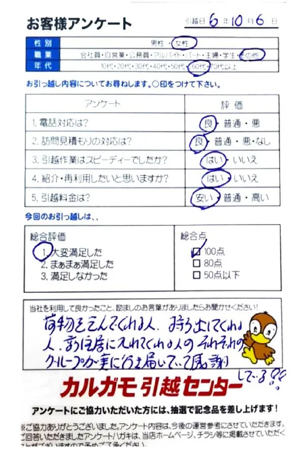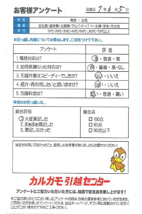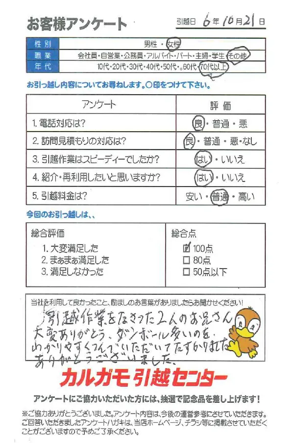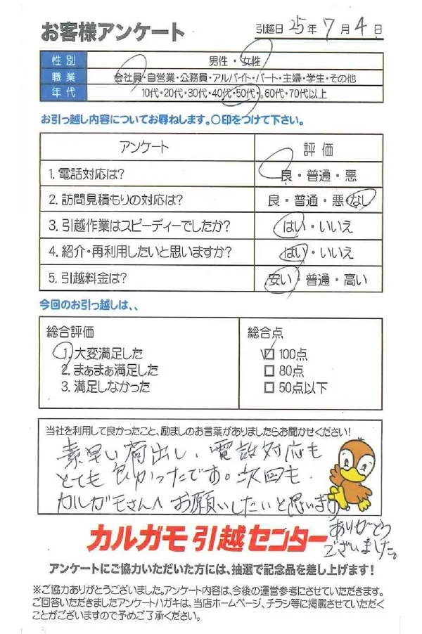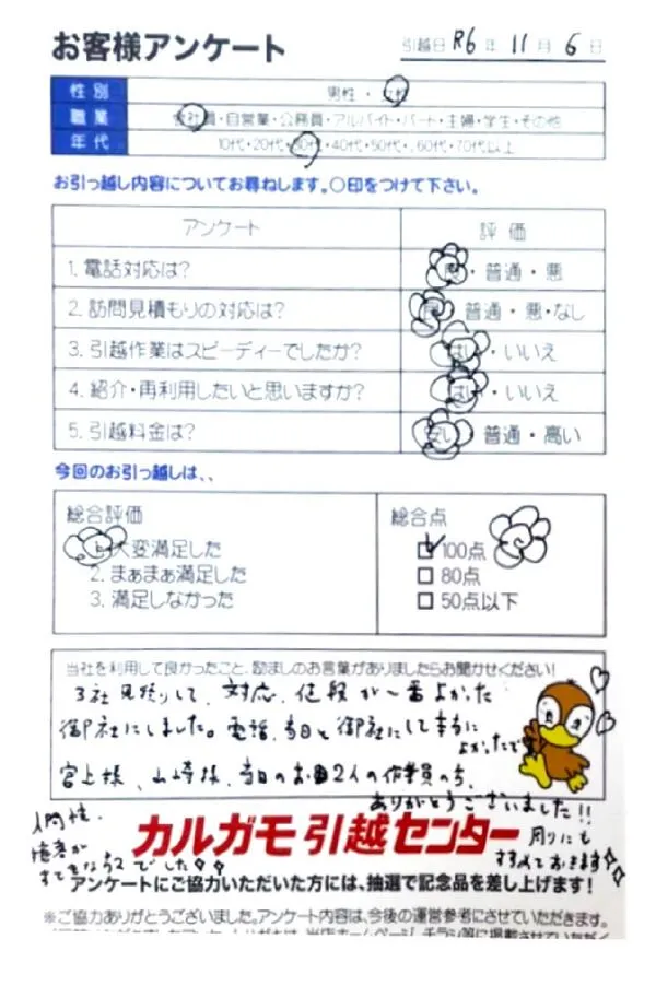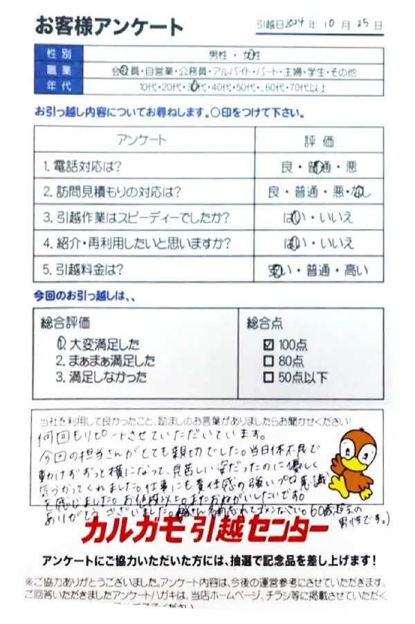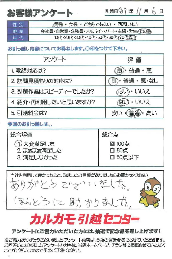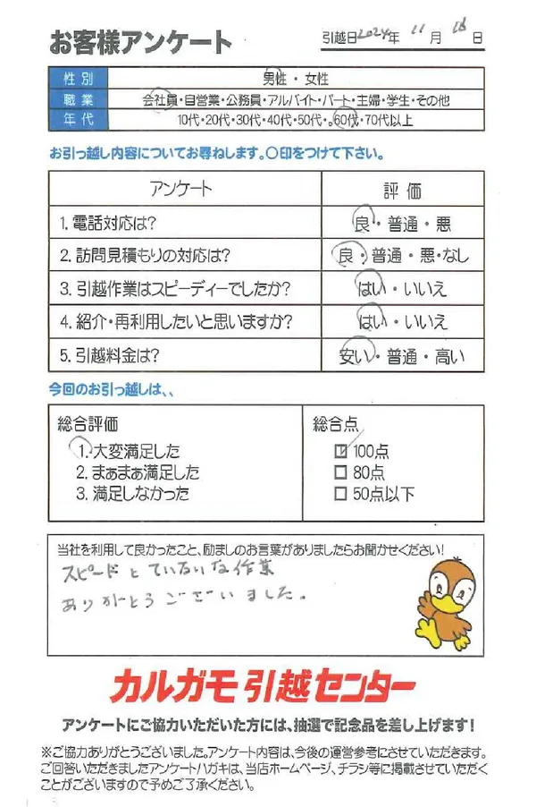 カルガモ引越しセンターをご利用いただいたお客様の体験談・口コミ・評判を掲載しています。