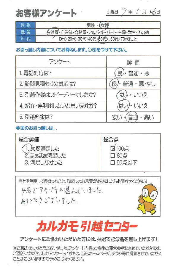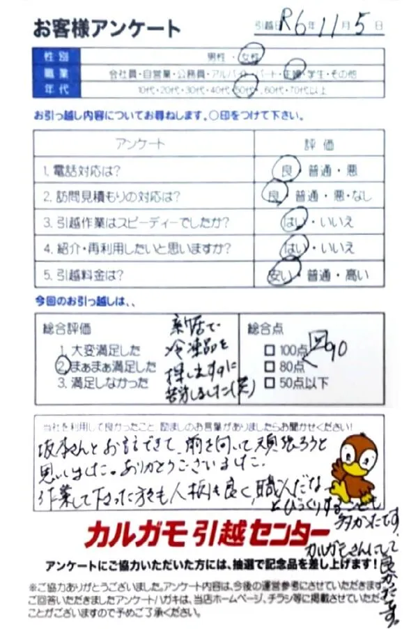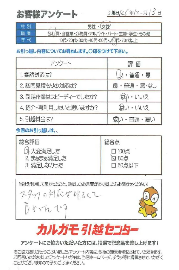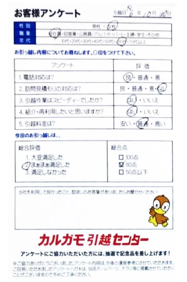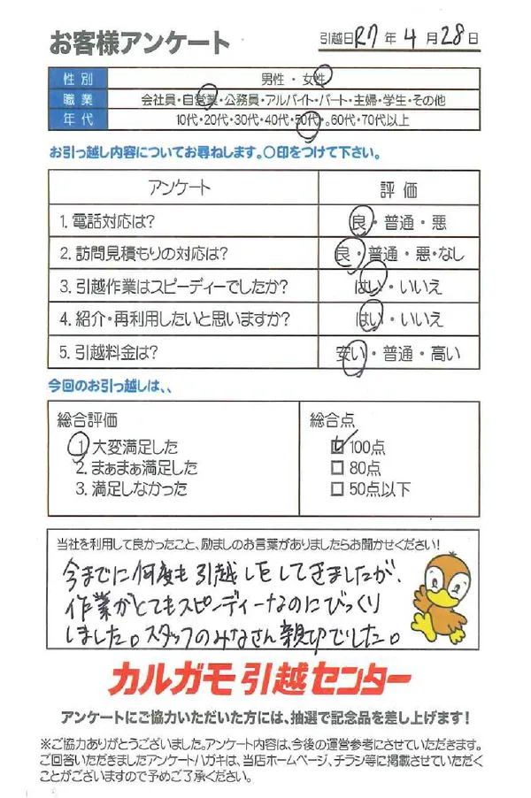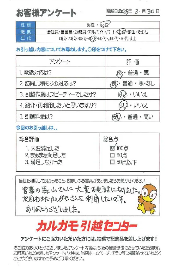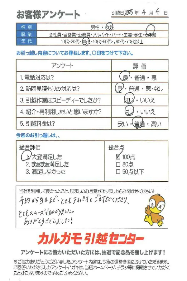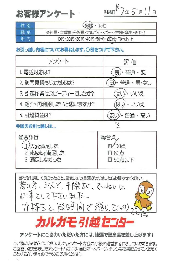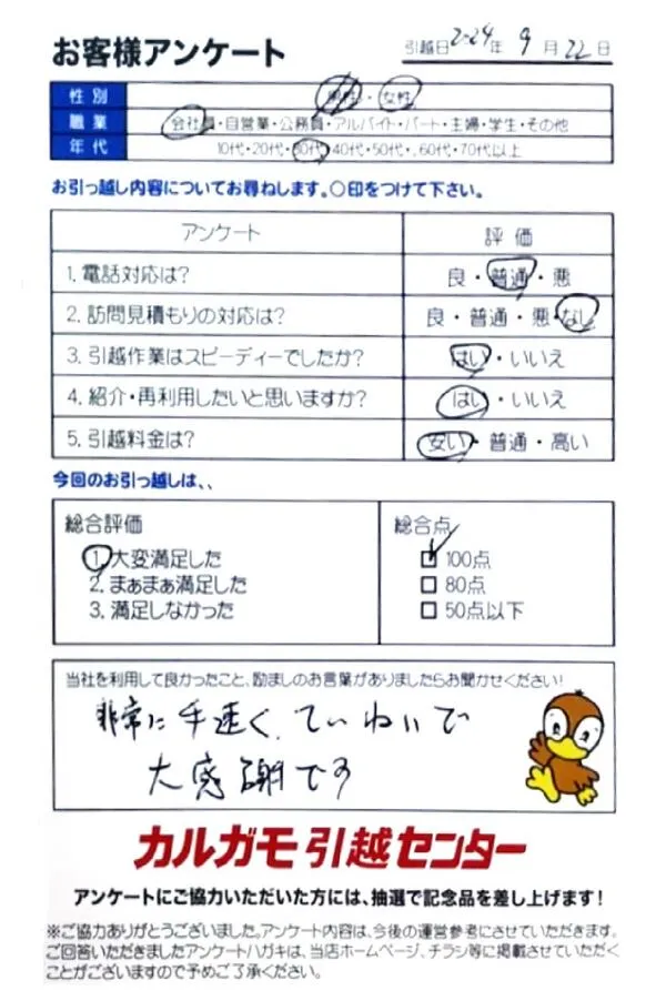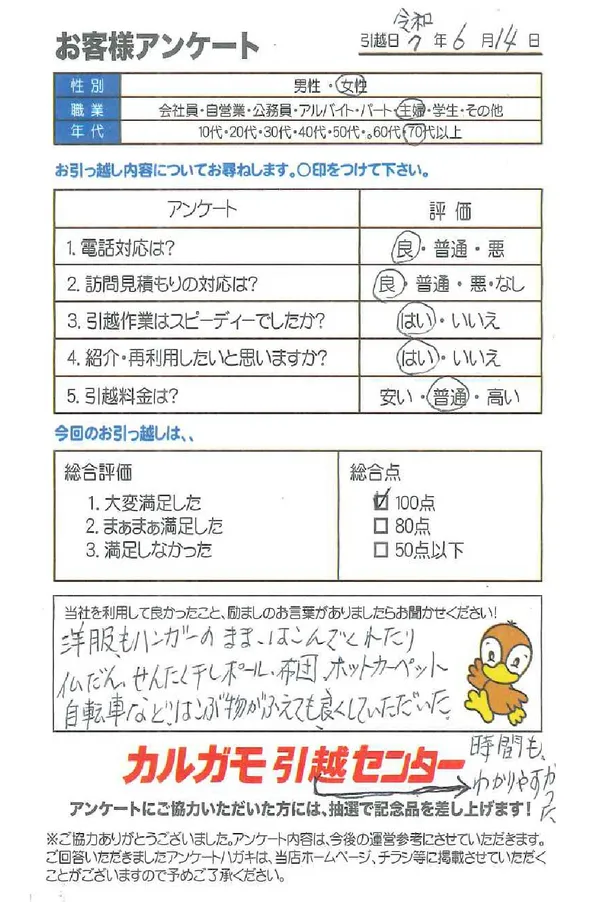 カルガモ引越しセンターをご利用いただいたお客様の体験談・口コミ・評判を掲載しています。