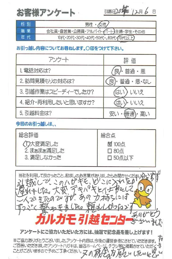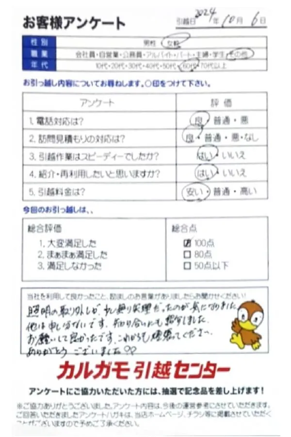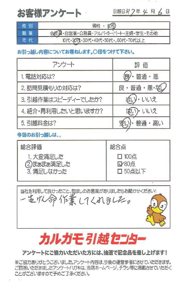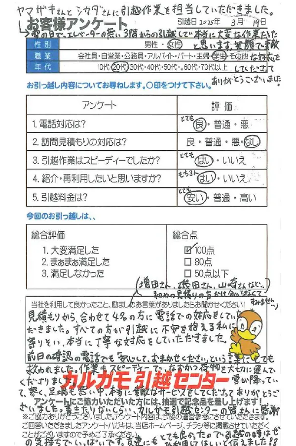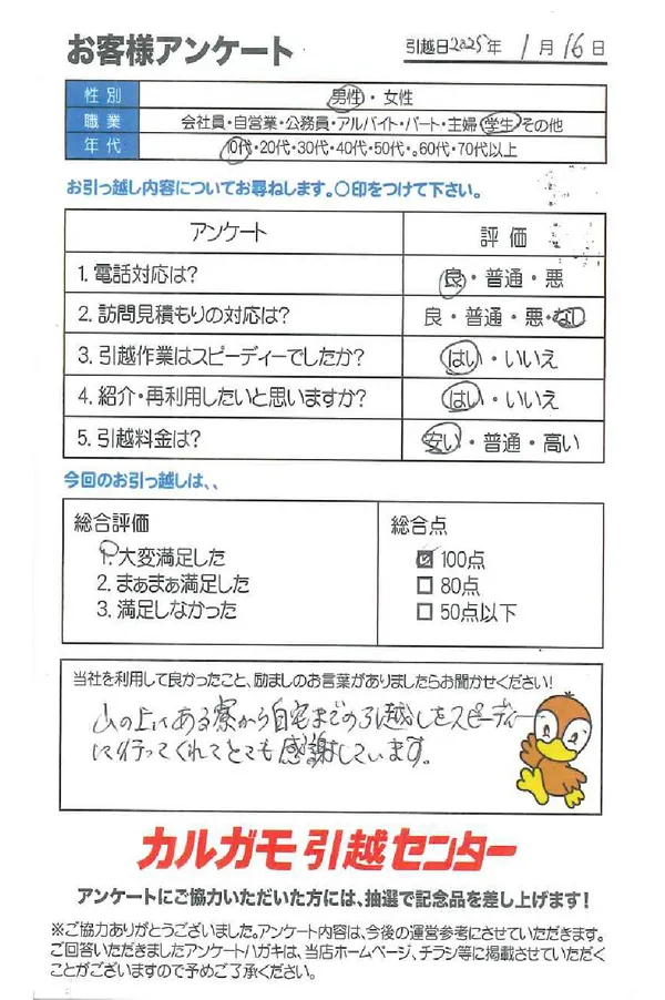 山の上にある寮から自宅までの引越をスピーディーに行ってくれてとても感謝しています