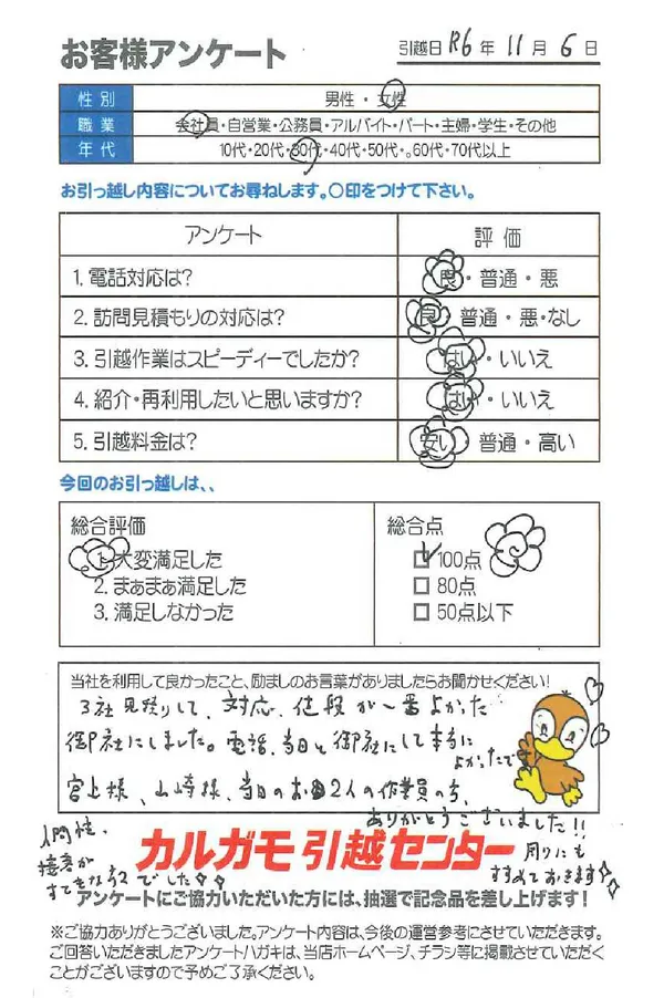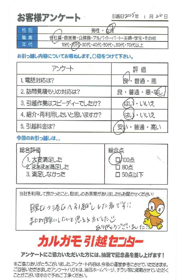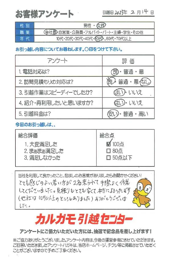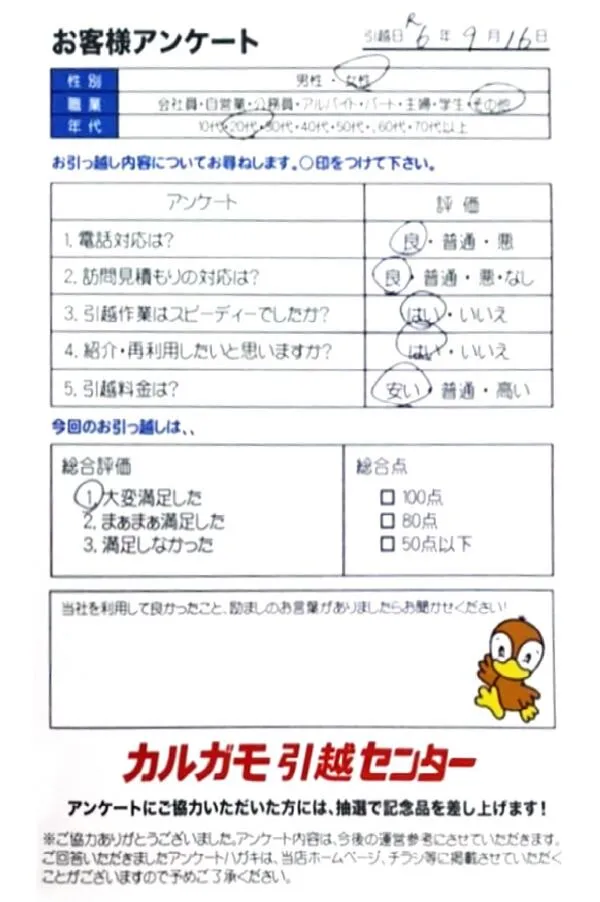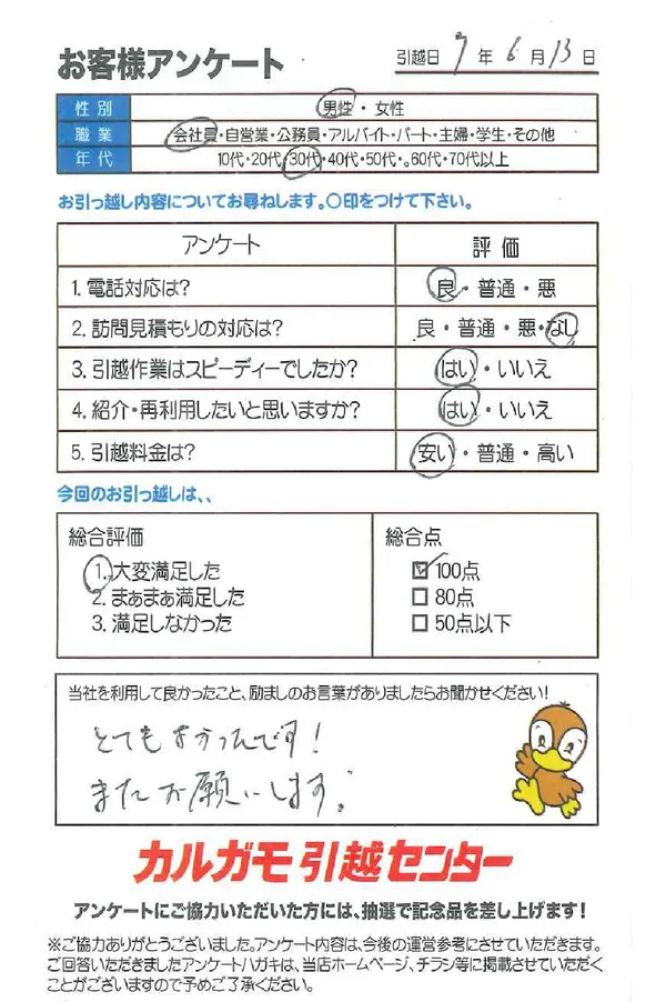 3社引越し見積もりして対応、値段が一番良かった御社にしました。電話、当日と御社にして本当に良かったです。