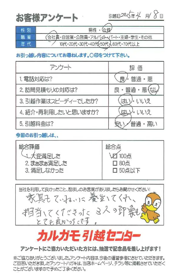 - 色々な引っ越し業者に連絡をして比較した結果、安かったカルガモさんにお願いしました。
